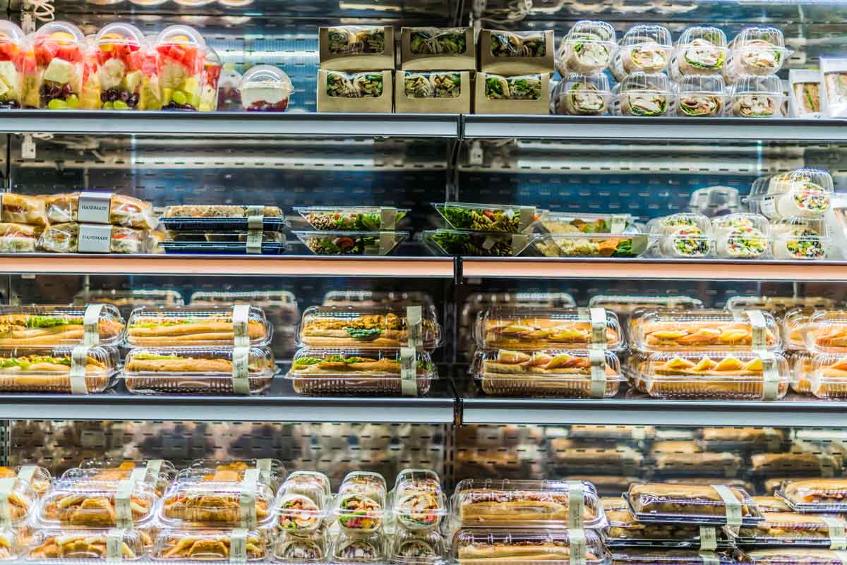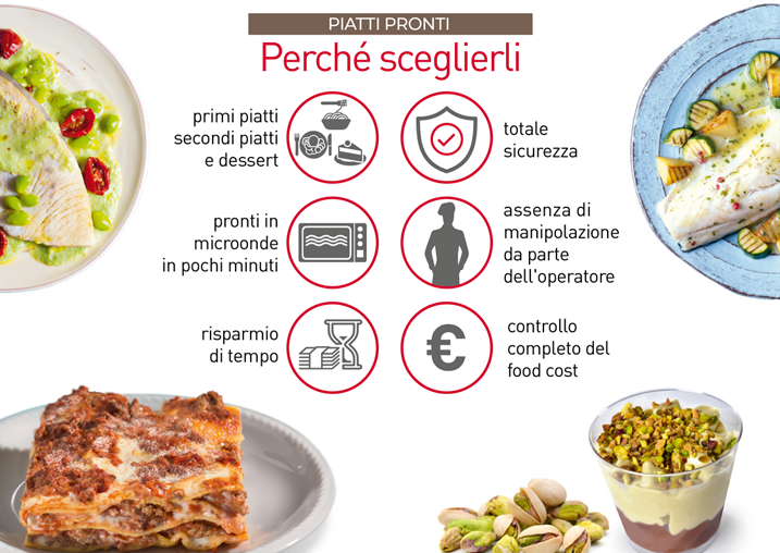 Un assortimento completo (primi e secondi piatti, dressing per insalate, tramezzini e panini, gelati e dessert, succhi di frutta, bibite) per la ristorazione veloce da asporto, senza necessità di manipolazioni, da prendere e portare via in totale sicurezza.